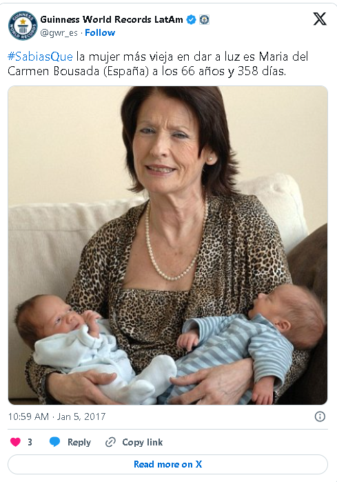 It was Maria’s belief that everyone should be able to choose when they want to start a family, instead of being pressured into it by society or the expectations of others. El récord de la madre viva de mayor edad lo posee María del Carmen Bousada Lara de España, fue madre a los 66 años y 358 días en el 2006. Posted by La Arboleda Residencial on Wednesday, April 24, 2013 Diagnosed with cancer As per The Guardian newspaper, she said at the time: “Often circumstances put you between a rock and a hard place, and maybe things shouldn’t have been done in the way they were done, but that was the only way to achieve the thing I had always dreamed of.” Naturally, not everyone agreed with her.