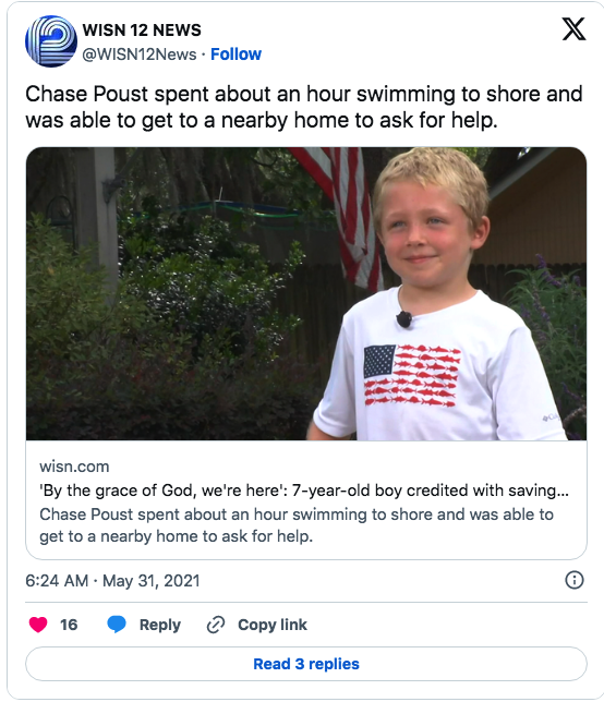 What a close call! Thank God little Chase was able to swim and get the help that was so desperately needed.