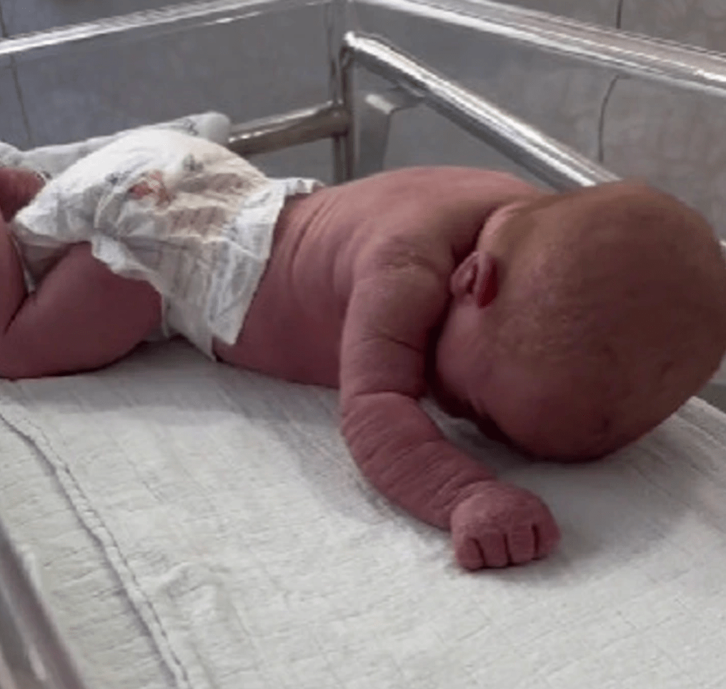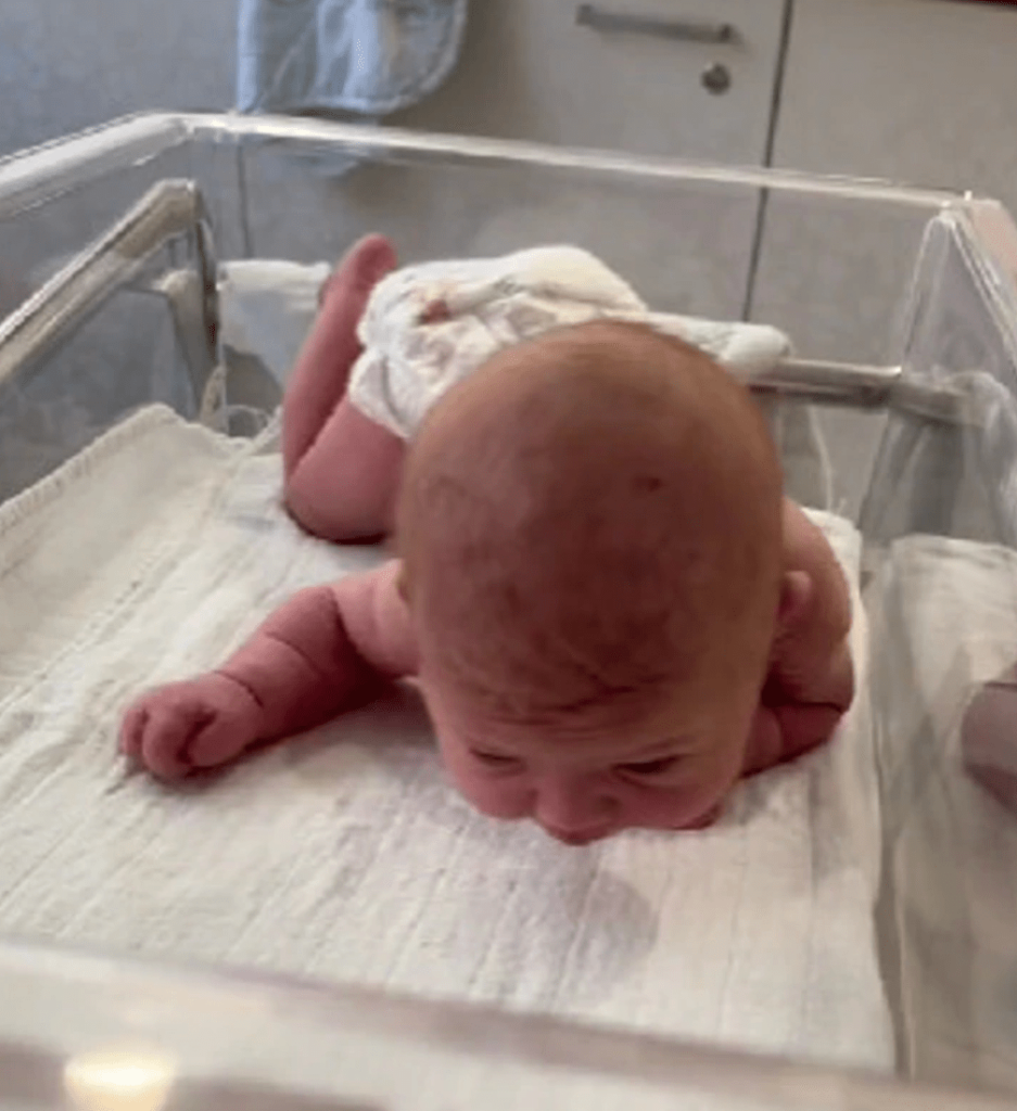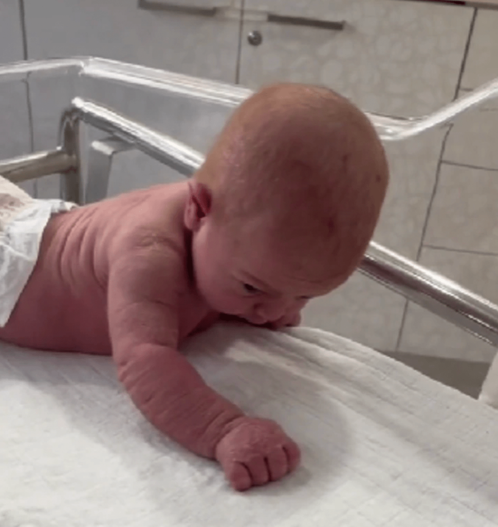 Samantha was shocked to see her newborn Nyilah resting on her stomach in the hospital cot; her head raised, and attempting to crawl, all three days after birth.