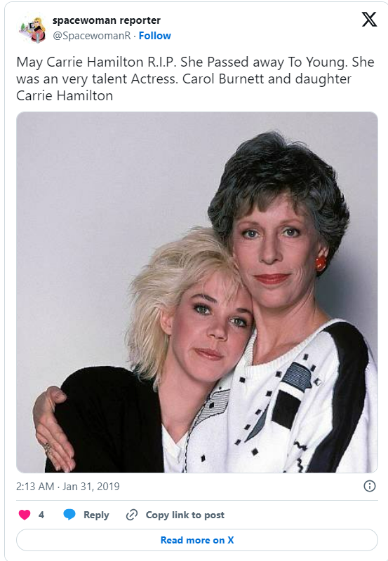 Emphasizing Hamilton’s death, Burnett focused on the fragility of life. She explained, “You don’t know. Life can change on a dime. So just be grateful for today what you have.” As a tribute to her daughter who had passed away, Burnett wrote and published a memoir in 2014 titled “Carrie and Me: A Mother-Daughter Love Story.”