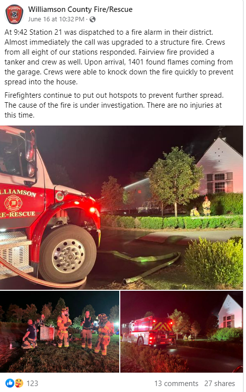 Early Monday morning, the Williamson County Fire Rescue released a statement on its Facebook page, detailing the events of the night before. In part, it said that investigations were underway to determine what could have caused the fire. Still, there are speculations that the fire might have been sparked by a UTV that was parked next to the garage.