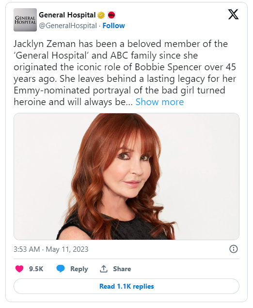 “I’m very happy that I got to spend so much time with this lovely woman. Jackie had the best stories to tell, a contagious spirit, and such a remarkable life. She enjoyed working on General Hospital,” Laura Wright, who portrayed Carly Spencer, the character who was Zeman’s daughter in the serial show, stated on Instagram.