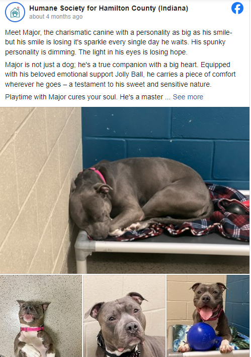 Major has been in the shelter ever since. But despite that heartbreaking rejection, the humane society says that in the beginning Major was in good spirits, describing him as a “sweet and sensitive” dog, a “true companion with a big heart” who loves to play and loves his Jolly Ball.