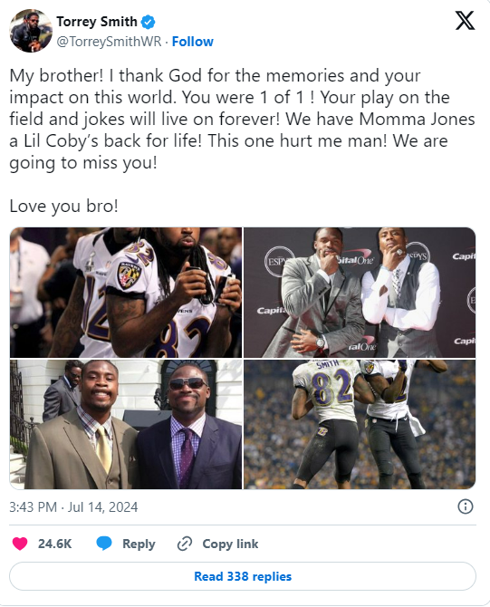 Ravens Hall of Fame linebacker Ray Lewis included multiple pictures of his departed comrade with his X post. He referred to Jacoby as his brother and said that he would be missed, just like Torrey was.