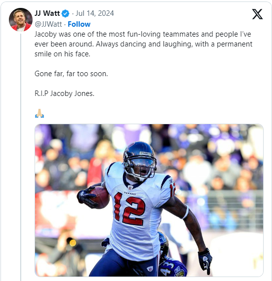 Among the first people to grieve for Jacoby were his coworkers. The defensive end for the Texans, J.J. Watt, posted a photo of the late player on Instagram. He said, “Jacoby was one of the most fun-loving teammates and people I’ve ever been around.”