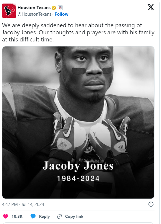The Houston Texans posted a black-and-white photo of the deceased athlete along with a statement expressing their “deep sadness” at his passing. The group offered his family their condolences and best wishes. On social media, Jacoby’s supporters also expressed their sorrow and sympathies.