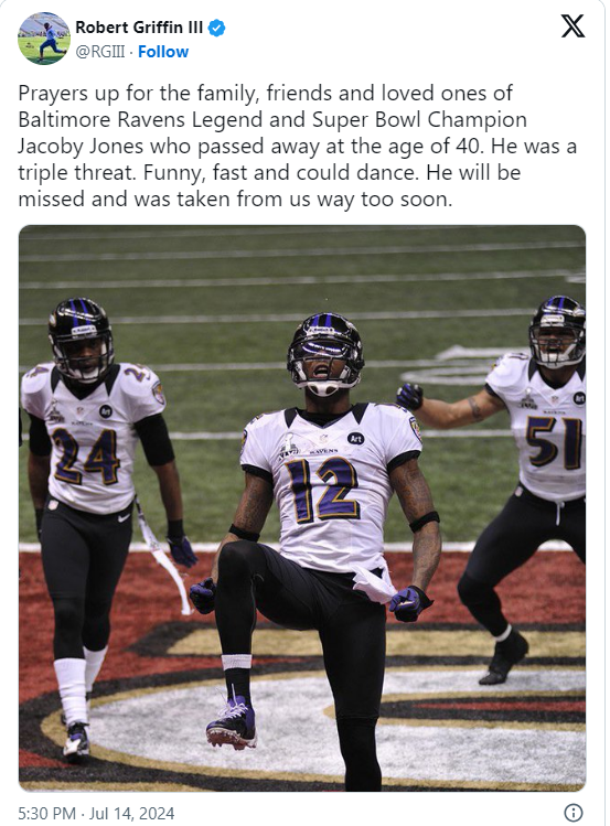 In addition, Robert Griffin III praised Jacoby with a photo of him and his Ravens colleagues having fun on the field. He prayed for the friend, family, and loved ones of the Super Bowl champion.