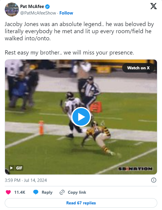 Reposting a GIF of Jacoby dancing after scoring a goal, Pat McAfee called him “an absolute legend.” He affirmed that the athlete who “lit up every room/field” had been adored by everyone he had met. “Rest easy my brother..we will miss your presence,” he continued.