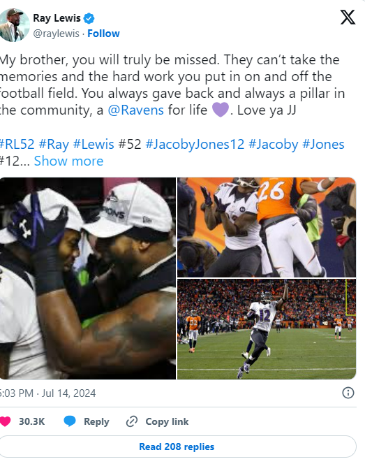 Ravens Hall of Fame linebacker Ray Lewis included multiple pictures of his departed comrade with his X post. He referred to Jacoby as his brother and said that he would be missed, just like Torrey was.