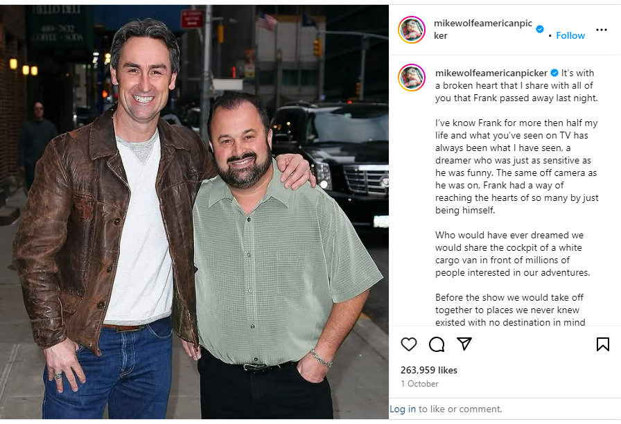 “Frank filmed ‘American Pickers’ for over a decade. We will always remember ‘the bearded charmer’ and his never-ending search for vintage motorcycles and bikes,” The History Channel and ‘American Pickers” production company Cineflix Production said in a joint statement. “Our thoughts are with Frank’s loved ones during this difficult time. He will be deeply missed.”