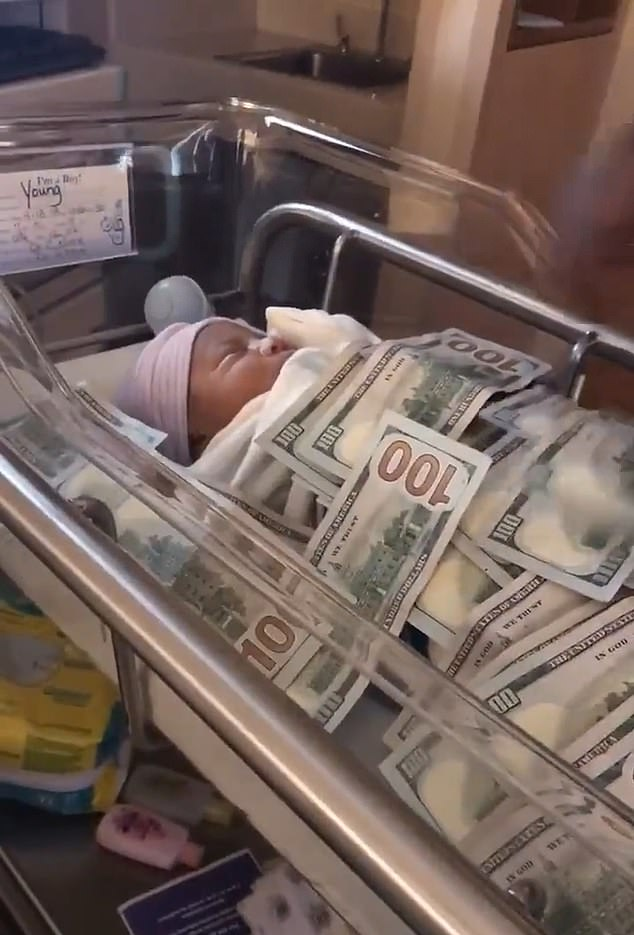 The sleeping newborn was seen lying in a crib in the hospital while an adult – believed to be a family member – showered the child in wads of cash. The stunt was not well received online