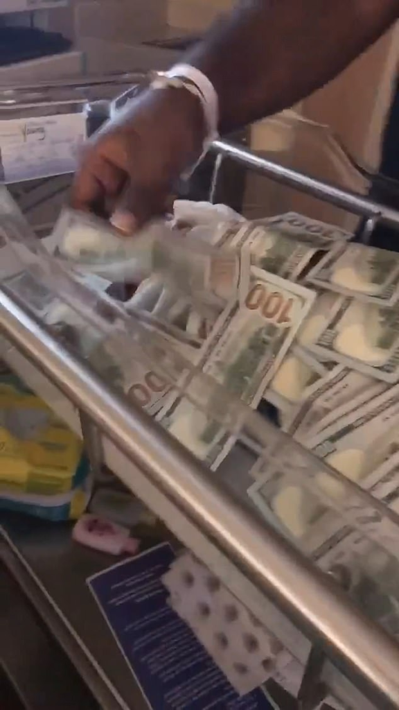 The sleeping newborn was seen lying in a crib in the hospital while an adult – believed to be a family member – showered the child in wads of cash.