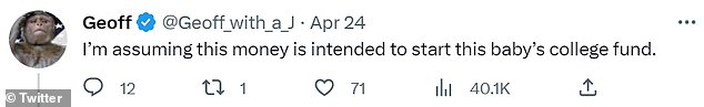 Instead of showering the child with the cash, one user said’: ‘um… what’s wrong with a savings account???’