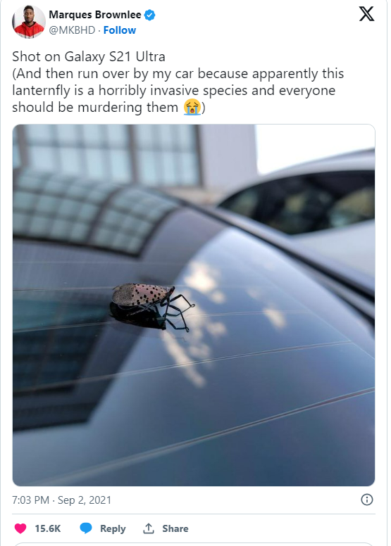 “Run over by my car because apparently this lanternfly is a horribly invasive species and everyone should be murdering them,” writes New Jersey’s social media influencer Marques Brownlee.