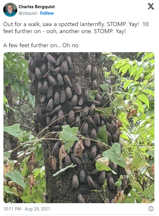Another user shares his triumph over his recent kills: “Out for a walk, saw a spotted lanternfly. STOMP. Yay! 10 feet further on, ooh, another one. STOMP. Yay!”