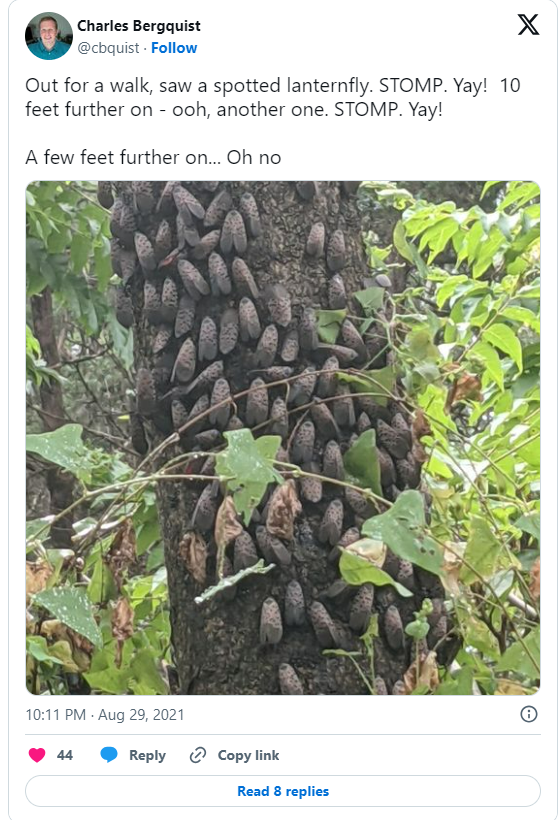 Another user shares his triumph over his recent kills: “Out for a walk, saw a spotted lanternfly. STOMP. Yay! 10 feet further on, ooh, another one. STOMP. Yay!”