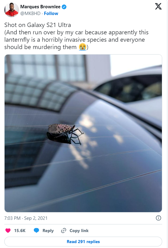“Run over by my car because apparently this lanternfly is a horribly invasive species and everyone should be murdering them,” writes New Jersey’s social media influencer Marques Brownlee.