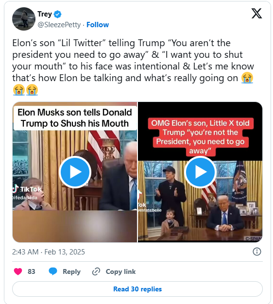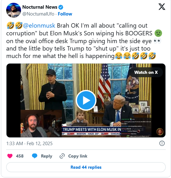 One such reaction was a humorous tweet: “OK I’m all about ‘calling out corruption’, but Elon Musk’s Son wiping his boogers on the Oval Office desk while Trump gives him the side-eye, and then the little one tells Trump to ‘shut up’. It’s just too much hilarity!”