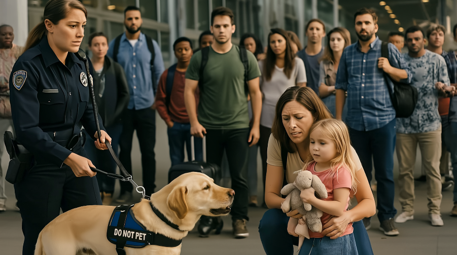 “Easy, boy,” said Officer Daniels, Max’s handler, but the dog showed no sign of easing. He strained against the leash, tail rigid, his gaze locked on the girl. More precisely — the teddy bear she clutched like a lifeline.