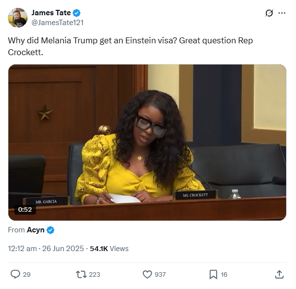 Crockett remarked, “When comparing to renowned models like Tyra Banks, Melania’s modeling career doesn’t seem to fit the ‘Einstein’ criteria.” Her comments have been widely shared and praised for addressing this disparity.