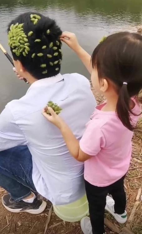 A picture captured showing a daughter placing strange looking items on her fathers head has gone viral.