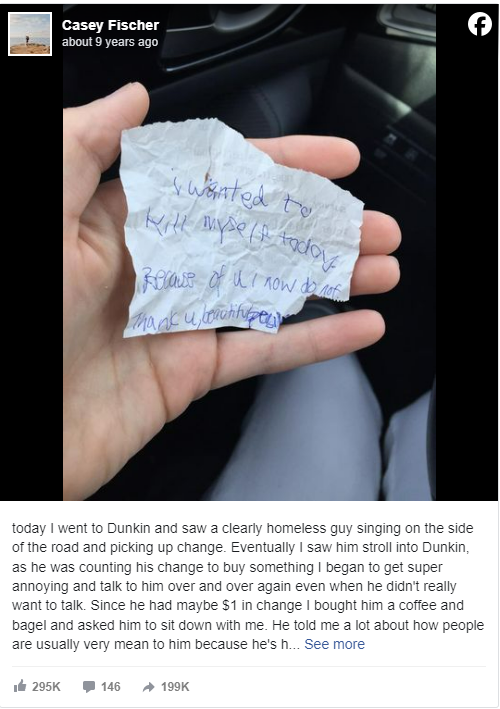She was at Dunkin’ Donuts when she saw a homeless man on the side of the road picking up change. He eventually went inside and started to count his money. She started talking to the man, much to his annoyance. She noticed he only had about $1 of change in his hand, so she decided to buy him a coffee and bagel out of her own pocket if he would sit and talk with her. He obliged. The two of them chatted for well over an hour before she realized she needed to get back to class. That’s when he told her to wait and handed her a note.