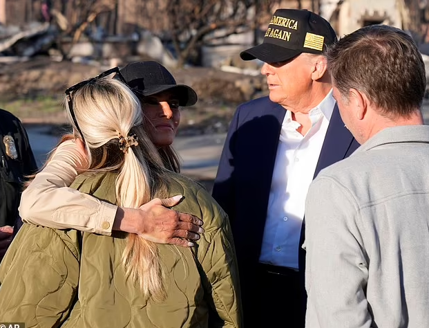 President Donald Trump watches as first lady Melania Trump hugs a resident, as they tour the Pacific Palisades neighborhood affected by recent wildfires in Los Angeles