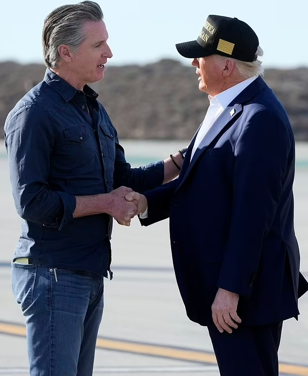 Despite prior tensions, President Trump and Governor Gavin Newsom exchanged a cordial handshake upon Trump’s arrival at LAX with First Lady Melania Trump.